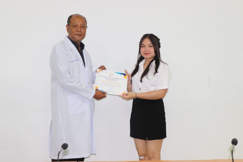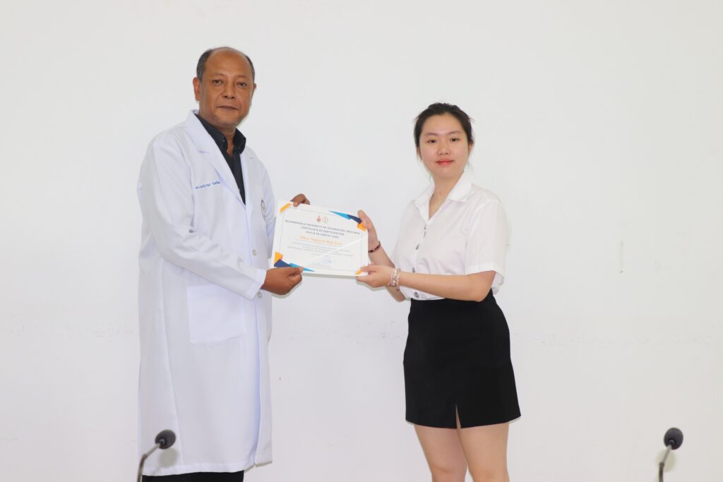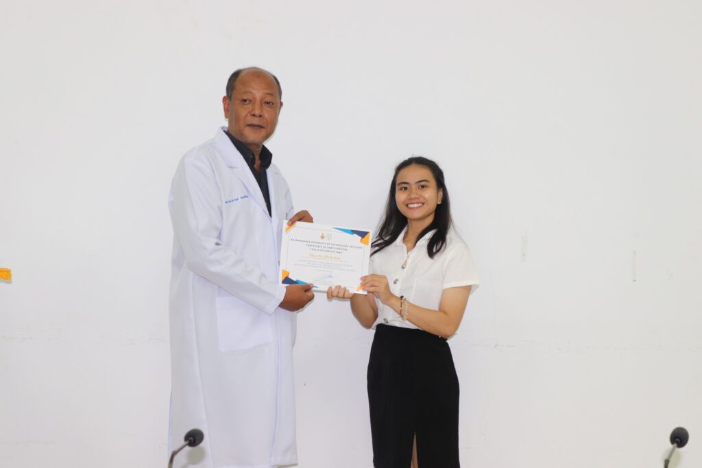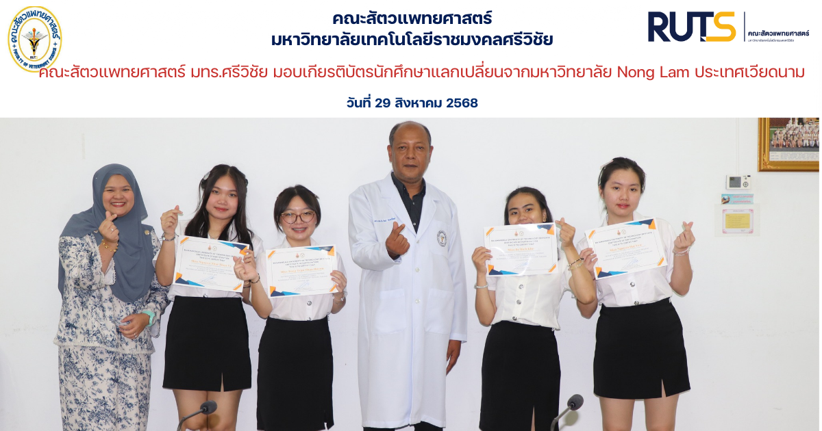 ผู้ช่วยศาสตราจารย์ น.สพ.ธีระวิทย์ จันทร์ทิพย์ คณบดีคณะสัตวแพทยศาสตร์ มหาวิทยาลัยเทคโนโลยีราชมงคลศรีวิชัย พร้อมด้วยอ.สพ.ญ.ซาราห์ นิแอ เข้าร่วมพิธีมอบเกียรติบัตรแก่นักศึกษาแลกเปลี่ยนจาก Faculty of Veterinary Medicine, Nong Lam University ประเทศเวียดนาม ณ ห้องประชุม 1 อาคารโรงพยาบาลสัตว์เล็ก คณะสัตวแพทยศาสตร์ มหาวิทยาลัยเทคโนโลยีราชมงคลศรีวิชัย