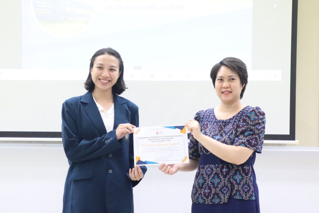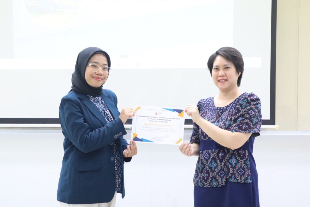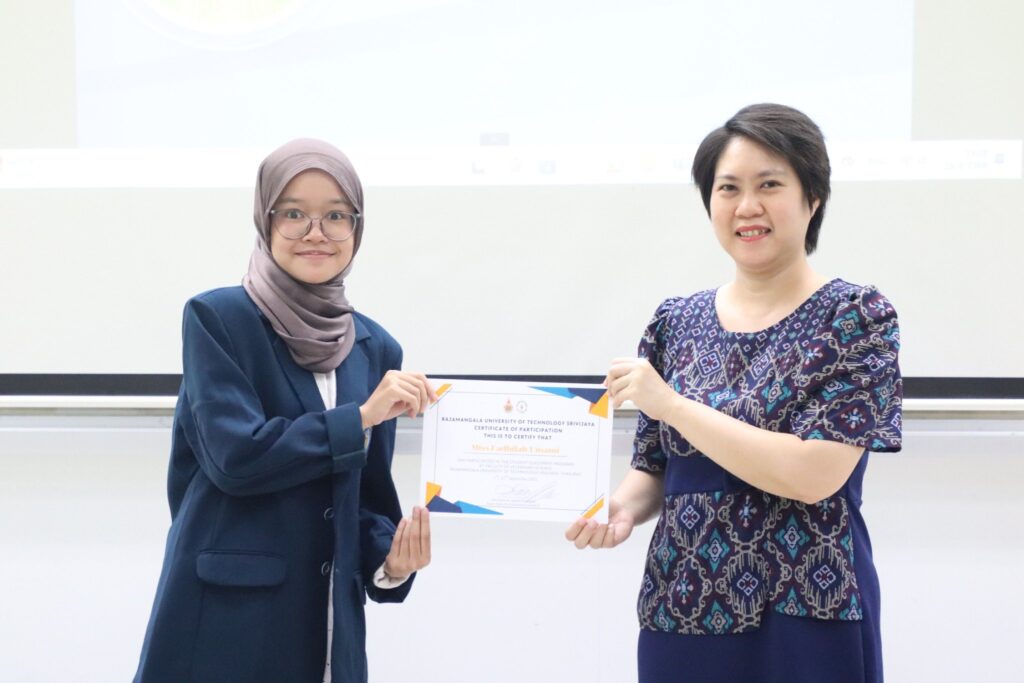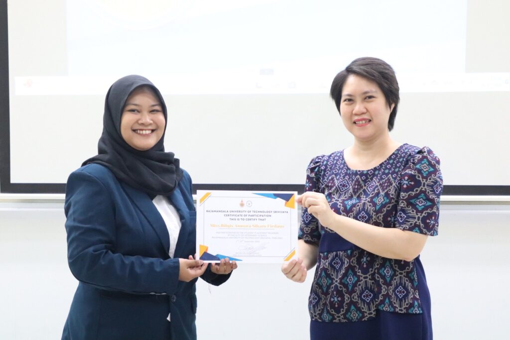 วันที่ 26 กันยายน 2568 ผู้ช่วยศาสตราจารย์ น.สพ.ธีระวิทย์ จันทร์ทิพย์ คณบดีคณะสัตวแพทยศาสตร์ มหาวิทยาลัยเทคโนโลยีราชมงคลศรีวิชัย มอบหมายให้ ผู้ช่วยศาสตราจารย์ สพ.ญ.ดร.วิภาวี แสงสร้อย รองคณบดีฝ่ายบริหารและวางแผน มอบเกียรติบัตรแก่นักศึกษาแลกเปลี่ยนจาก Faculty of Veterinary Medicine, Universitas Brawijaya ประเทศอินโดนีเซีย ภายใต้โครงการแลกเปลี่ยนนักศึกษาประจำปี 2025