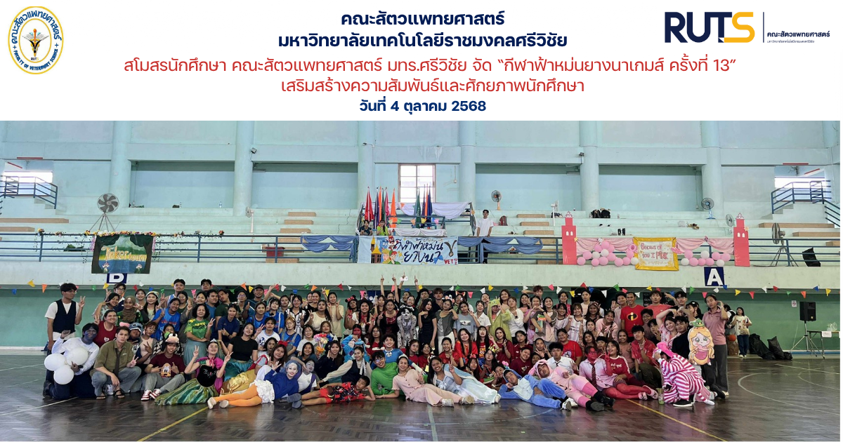 วันที่ 4 ตุลาคม 2568 สโมสรนักศึกษา คณะสัตวแพทยศาสตร์ มหาวิทยาลัยเทคโนโลยีราชมงคลศรีวิชัยจัดโครงการ “พัฒนาศักยภาพนักศึกษา” กิจกรรมย่อย “กีฬาฟ้าหม่นยางนาเกมส์ ครั้งที่ 13”เพื่อให้นักศึกษาคณะสัตวแพทยศาสตร์ได้มีส่วนร่วมในการทำกิจกรรมและเสริมสร้างความสัมพันธ์อันดีระหว่างเพื่อน รุ่นพี่ และรุ่นน้องภายในคณะโดย ผศ.น.สพ.ธีระวิทย์ จันทร์ทิพย์ คณบดีคณะสัตวแพทยศาสตร์ มอบหมายให้ อ.สพ.ญ.ดร.มธุรส สุวรรณเรืองศรี รองคณบดีฝ่ายพัฒนานักศึกษา คณะสัตวแพทยศาสตร์ มหาวิทยาลัยเทคโนโลยีราชมงคลศรีวิชัย เป็นประธานในพิธี ณ อาคารกิจกรรมนักศึกษา มหาวิทยาลัยเทคโนโลยีราชมงคลศรีวิชัย วิทยาเขตนครศรีธรรมราช