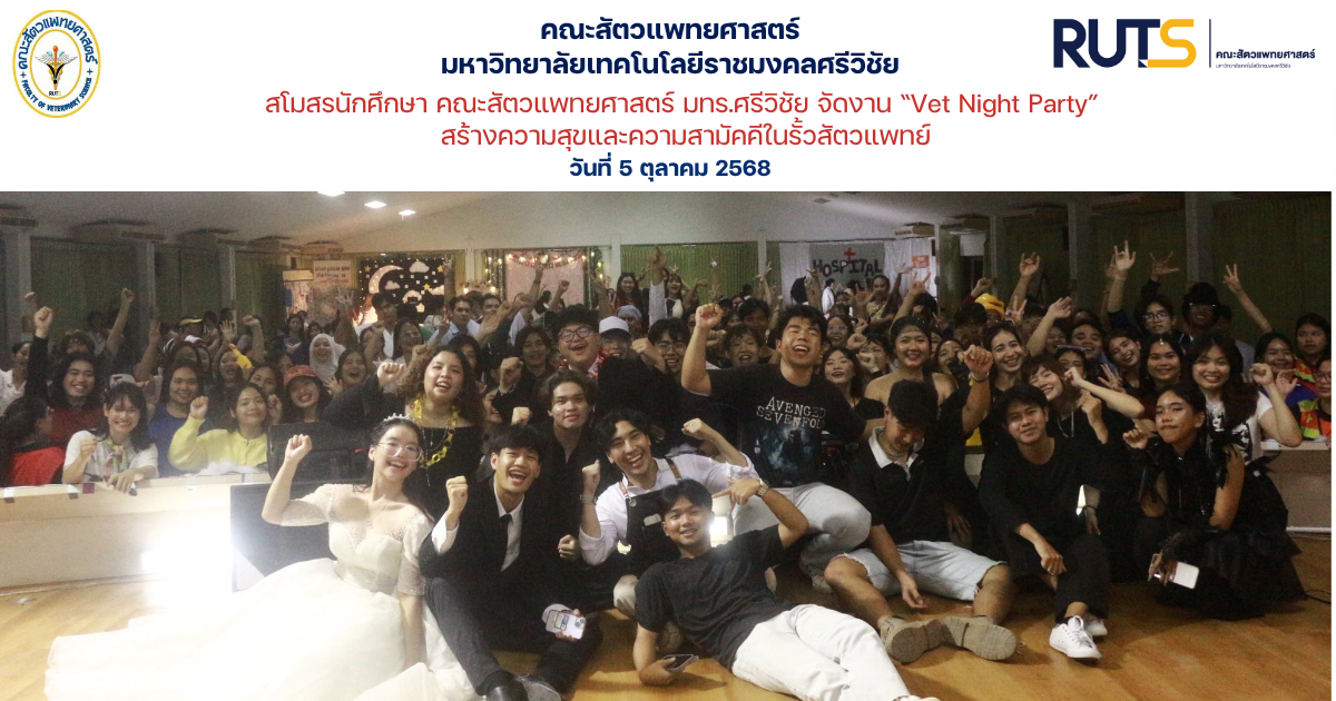 วันที่ 5 ตุลาคม 2568 สโมสรนักศึกษา คณะสัตวแพทยศาสตร์ มหาวิทยาลัยเทคโนโลยีราชมงคลศรีวิชัย จัดงาน “Vet Night Party” โดยได้รับเกียรติจาก ผู้ช่วยศาสตราจารย์ น.สพ.ธีระวิทย์ จันทร์ทิพย์ คณบดีคณะสัตวแพทยศาสตร์ เป็นประธานในพิธีเปิดงาน พร้อมด้วยคณาจารย์ เจ้าหน้าที่ และนักศึกษาที่เข้าร่วมงานกันอย่างอบอุ่น ณ อาคารอเนกประสงค์ มหาวิทยาลัยเทคโนโลยีราชมงคลศรีวิชัย วิทยาเขตนครศรีธรรมราช (ทุ่งใหญ่)