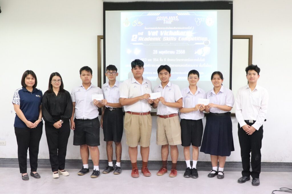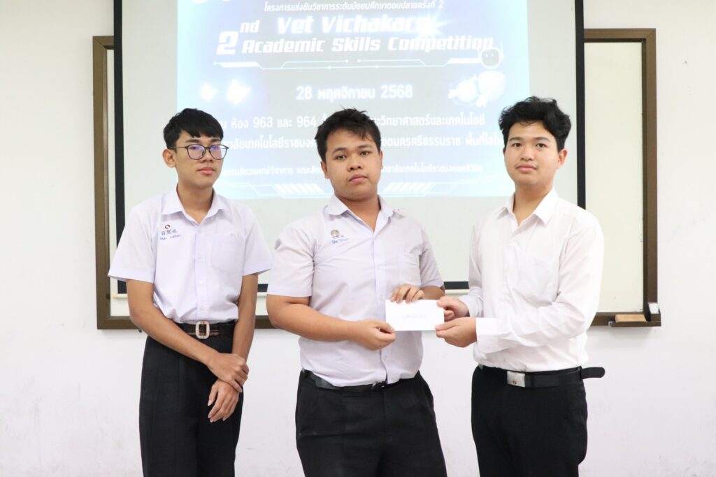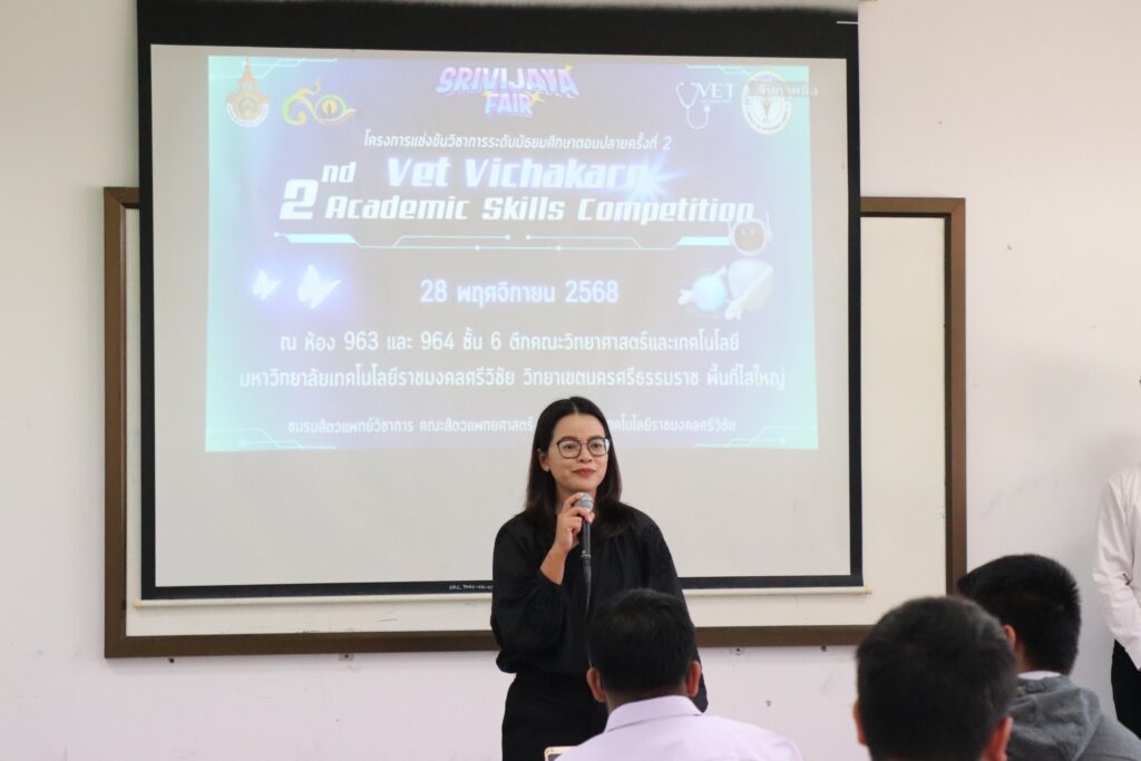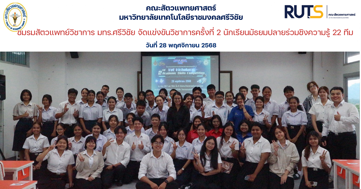 วันที่ 28 พฤศจิกายน 2568 ชมรมสัตวแพทย์วิชาการ สังกัดสโมสรนักศึกษาคณะสัตวแพทยศาสตร์ มหาวิทยาลัยเทคโนโลยีราชมงคลศรีวิชัย จัดโครงการ “แข่งขันวิชาการ” ระดับมัธยมศึกษาตอนปลาย ครั้งที่ 2 ได้รับเกียรติจาก อ.สพ.ญ.ดร.มธุรส สุวรรณเรืองศรี รองคณบดีฝ่ายพัฒนานักศึกษา ผู้เข้าร่วมการแข่งขันทั้งสิ้น 22 ทีม จำนวน 44 คน ณ ห้อง 963 ชั้น 6 คณะวิทยาศาสตร์และเทคโนโลยี มหาวิทยาลัยเทคโนโลยีราชมงคลศรีวิชัย วิทยาเขตนครศรีธรรมราช พื้นที่ไสใหญ่