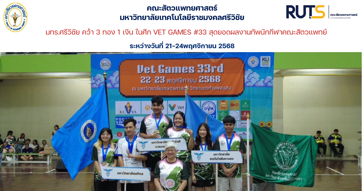 คณะสัตวแพทยศาสตร์ มทร.ศรีวิชัย ขอแสดงความยินดีกับ ทัพนักกีฬา คณะสัตวแพทยศาสตร์ ม.ศรีวิชัย ที่สร้างผลงานได้อย่างยอดเยี่ยมในการเข้าร่วมการแข่งขัน กีฬาสัตวแพทย์สัมพันธ์ ครั้งที่ 33 (VET GAMES #33) ณ มหาวิทยาลัยเกษตรศาสตร์ วิทยาเขตกำแพงแสน จ.นครปฐม ระหว่างวันที่ 21-24 พฤศจิกายน 2568!
