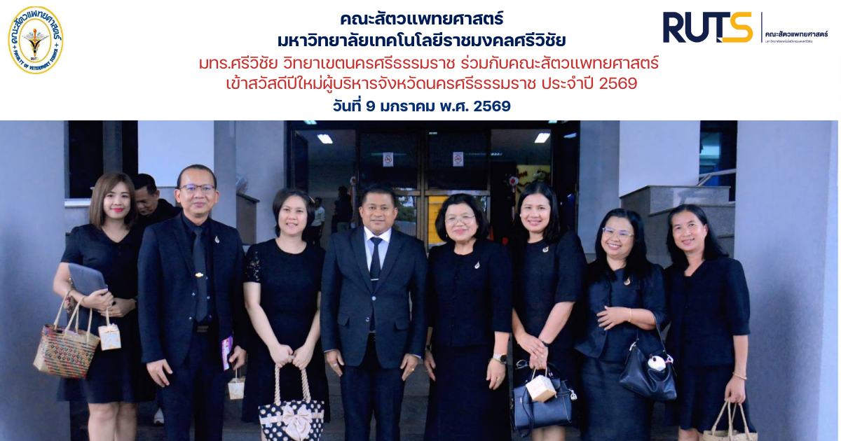 วันที่ 9 มกราคม พ.ศ. 2569 ผู้ช่วยศาสตราจารย์ น.สพ.ธีระวิทย์ จันทร์ทิพย์ คณบดีคณะสัตวแพทยศาสตร์ มหาวิทยาลัยเทคโนโลยีราชมงคลศรีวิชัย มอบหมายให้ ผู้ช่วยศาสตราจารย์ สพ.ญ.ดร.วิภาวี แสงสร้อย รองคณบดีฝ่ายบริหารและวางแผน พร้อมด้วยคณะผู้บริหาร คณบดี ผู้อำนวยการวิทยาลัย และผู้ติดตามของมหาวิทยาลัยเทคโนโลยีราชมงคลศรีวิชัย เข้าพบคณะผู้บริหารจังหวัดนครศรีธรรมราช เนื่องในโอกาสเทศกาลวันขึ้นปีใหม่ ประจำปี พ.ศ. 2569 ณ ศาลากลางจังหวัดนครศรีธรรมราช