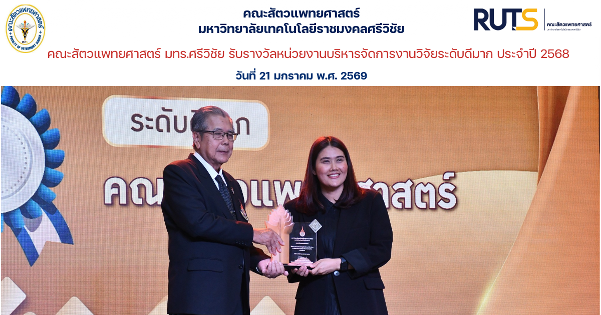 คณะสัตวแพทยศาสตร์ มทร.ศรีวิชัย รับรางวัลหน่วยงานบริหารจัดการงานวิจัยระดับดีมาก ประจำปี 2568