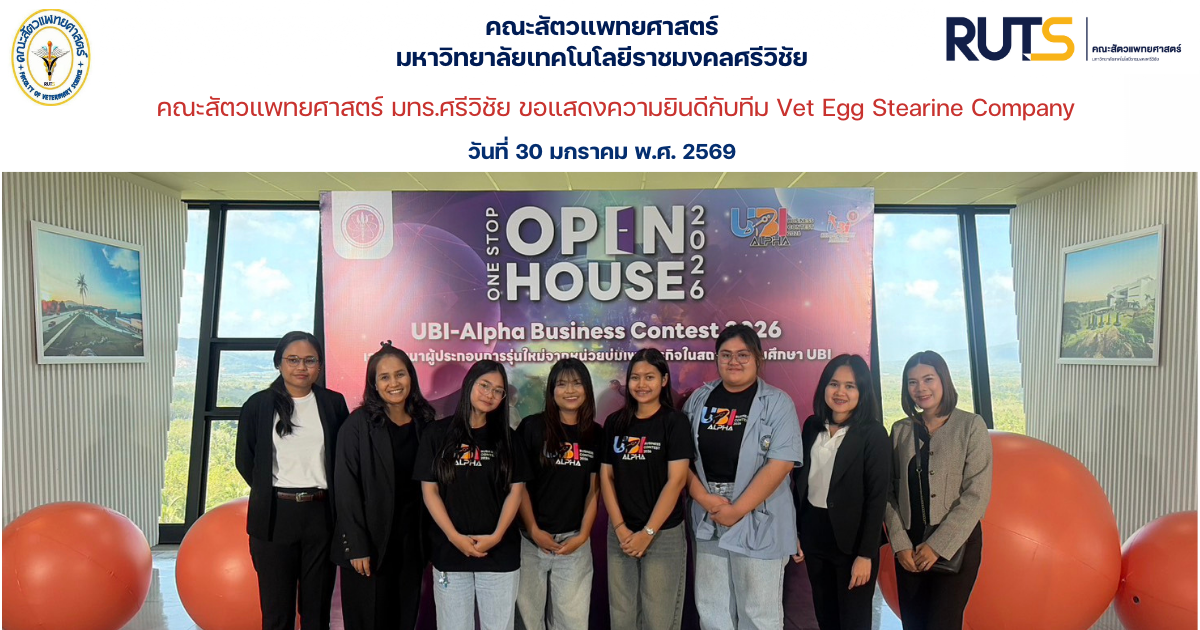 คณะสัตวแพทยศาสตร์ มหาวิทยาลัยเทคโนโลยีราชมงคลศรีวิชัย ขอแสดงความยินดีกับ ทีม Vet Egg Stearine Company ทีมความร่วมมือระหว่างนักศึกษาและนักเรียน ที่สามารถคว้ารางวัล ชนะเลิศ ประเภท Green and Climate Change Solutions (ธุรกิจสีเขียวและธุรกิจที่เป็นมิตรต่อสิ่งแวดล้อม) จากเวทีการแข่งขัน UBI Alpha Business Contest 2026 ระดับภาคใต้ เมื่อวันที่ 30 มกราคม 2569 ณ อุทยานวิทยาศาสตร์ มหาวิทยาลัยสงขลานครินทร์