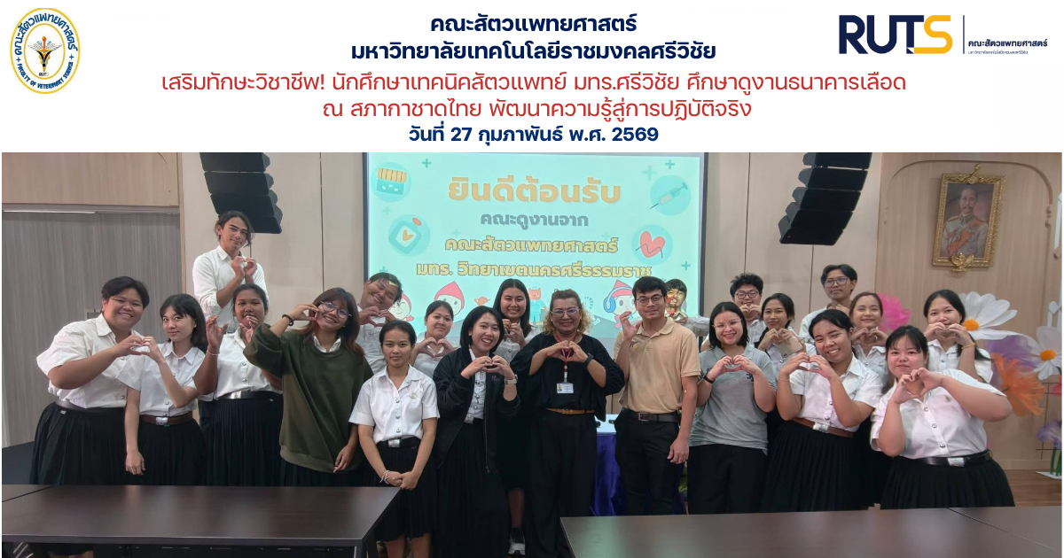 เมื่อวันที่วันที่ 27 กุมภาพันธ์ 2569 รายวิชการจัดการธนาคารเลือดสัตว์ ได้นำนักศึกษาสาขาวิชาเทคนิคสัตวแพทย์ 3 เข้าศึกษาดูงาน ณ ภาคบริการโลหิตแห่งชาติที่ 11 จังหวัดนครศรีธรรมราช สภากาชาดไทย ตำบลปากแพรก อำเภอทุ่งสง จังหวัดนครศรีธรรมราช เพื่อเปิดโอกาสให้นักศึกษาได้เรียนรู้และรับประสบการณ์จริงเกี่ยวกับกระบวนการได้มาของโลหิต การตรวจคัดกรองโลหิต ตลอดจนขั้นตอนการเตรียมและการบริหารจัดการโลหิต ซึ่งเป็นองค์ความรู้สำคัญที่สามารถนำไปประยุกต์ใช้ในวิชาชีพสัตวแพทย์ในอนาคตได้