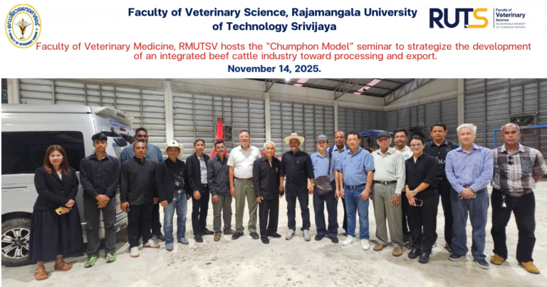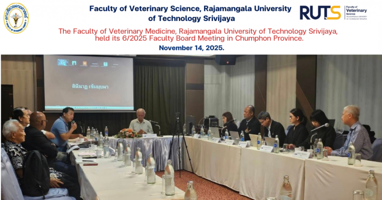 The Faculty of Veterinary Medicine, Rajamangala University of Technology Srivijaya, would like to congratulate the four Akkhraratchakumari Veterinary College, Walailak University students, who have successfully completed their professional training at the animal hospital. These students are Ms. Anna Petsingngern, Ms. Panisara Decha, Ms. Panrada Khongpan, and Ms. Panisara Wongmuang. Their training involved learning about various aspects of the veterinary profession and gaining practical experience from October 21 to November 1, 2024, at the Faculty of Veterinary Medicine, Rajamangala University of Technology Srivijaya. Assoc presented the certificates. Prof. Dr. Teerawit Chantip, Dean of the Faculty of Veterinary Medicine, along with Asst. Prof. Dr. Methasu Chanrod, Associate Dean for Academic Affairs and Research, and Assoc. Prof. Dr. Wipawee Saengsroi, Associate Dean for Administration and Planning, also extended their congratulations.