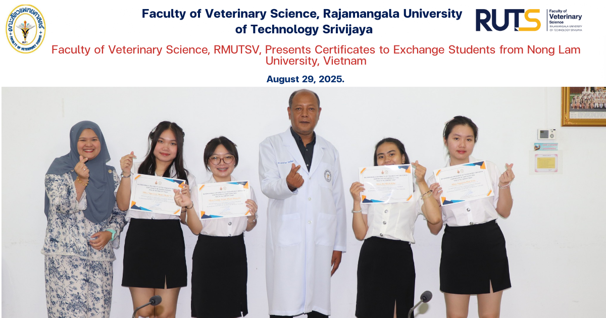 Assistant Professor Dr.Dhiravit Chantip, Dean of the Faculty of Veterinary Medicine, Rajamangala University of Technology Srivijaya, together with Dr. Sarah Nia, participated in the certificate awarding ceremony for exchange students from the Faculty of Veterinary Medicine, Nong Lam University, Vietnam. The event was held at Meeting Room 1, Small Animal Hospital Building, Faculty of Veterinary Medicine, Rajamangala University of Technology Srivijaya.