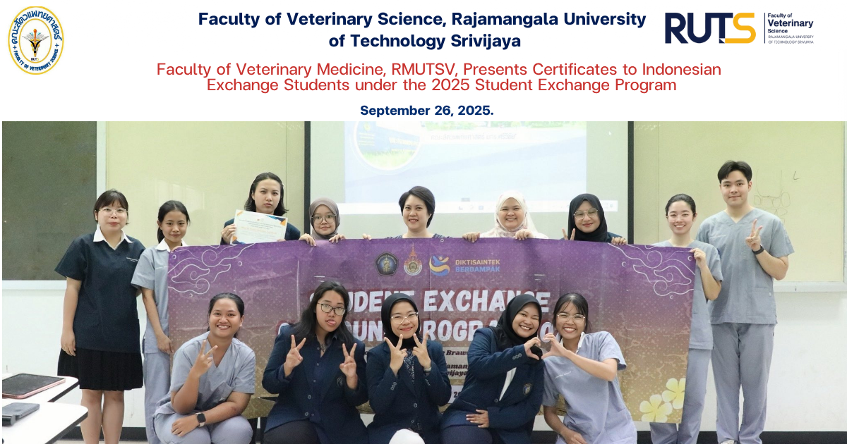 On September 26, 2025, Associate Professor Dr. Dhiravit Chantip, Dean of the Faculty of Veterinary Medicine, Rajamangala University of Technology Srivijaya, assigned Associate Professor Dr.Wipawee Saengsoi, Associate Dean for Administration and Planning, to present certificates to exchange students from the Faculty of Veterinary Medicine, Universitas Brawijaya, Indonesia, under the 2025 Student Exchange Program.