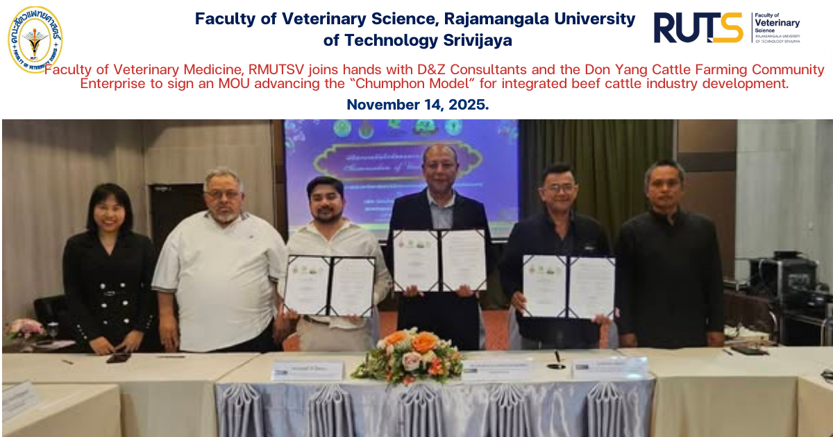 The agreement was signed by Asst.Prof.Dr.Dhiravit Chantip, Dean of the Faculty of Veterinary Medicine, acting on behalf of the President of RMUTSV, together with university executives, faculty members, and staff of the Faculty of Veterinary Medicine; executives from D&Z Consultants Co., Ltd., led by Dr. Adul Kailaithong, Managing Director; and representatives from the Don Yang Beef Cattle Farming Community Enterprise, led by Mr. Samphao Meechan, Chairman of the community enterprise.