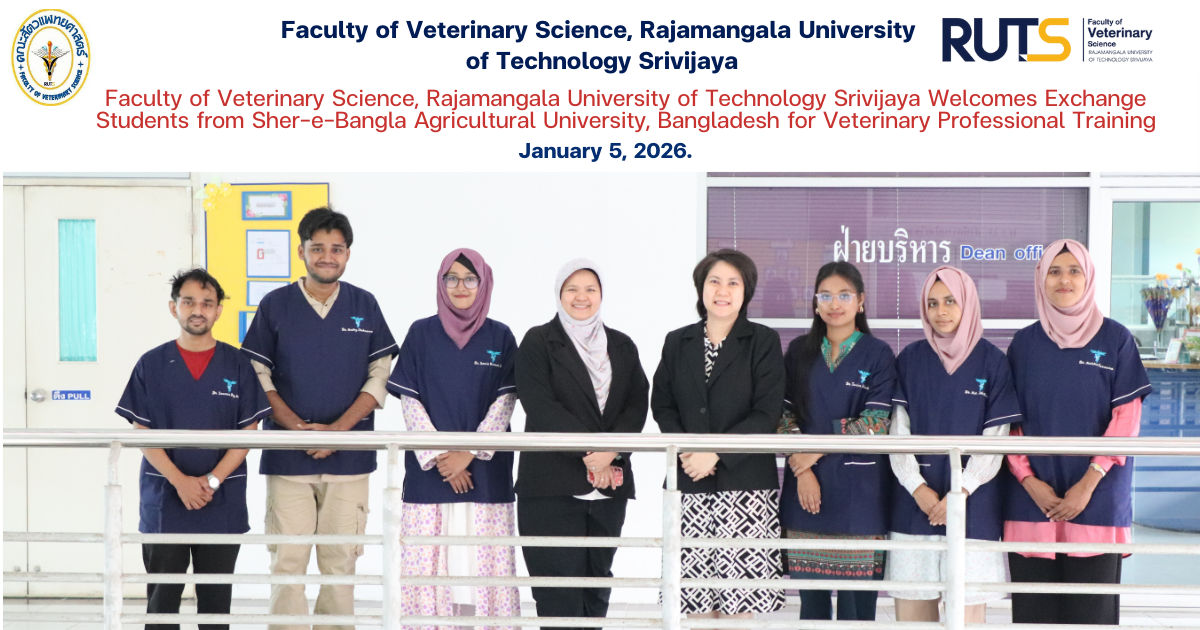On January 5, 2026, Assistant Professor Dr. Dhiravit Chantip, D.V.M., Dean of the Faculty of Veterinary Science, Rajamangala University of Technology Srivijaya, assigned Assistant Professor Dr. Wipawee Saengsoi, D.V.M., Ph.D., Associate Dean for Administration and Planning, and Assistant Professor Dr.Sara ni-ae, D.V.M., Assistant Dean for International Relations, to officially welcome six exchange students from the Department of Animal Science & Veterinary Medicine, Sher-e-Bangla Agricultural University, Bangladesh.